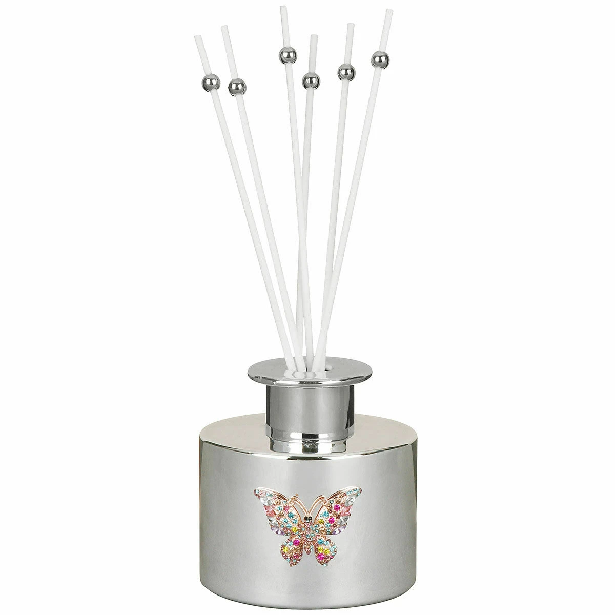 Presented in a clear glass jar with six white reeds, this diffuser is ideal for adding a shimmering touch to any room’s décor. The silver glass jar is ornate in its design with a rose gold butterfly on the front. The butterfly is embellished with beautiful, colourful diamantes that sparkle in the light. It comes with a matching silver lid and the white reeds are decorate with simple, silver beads.