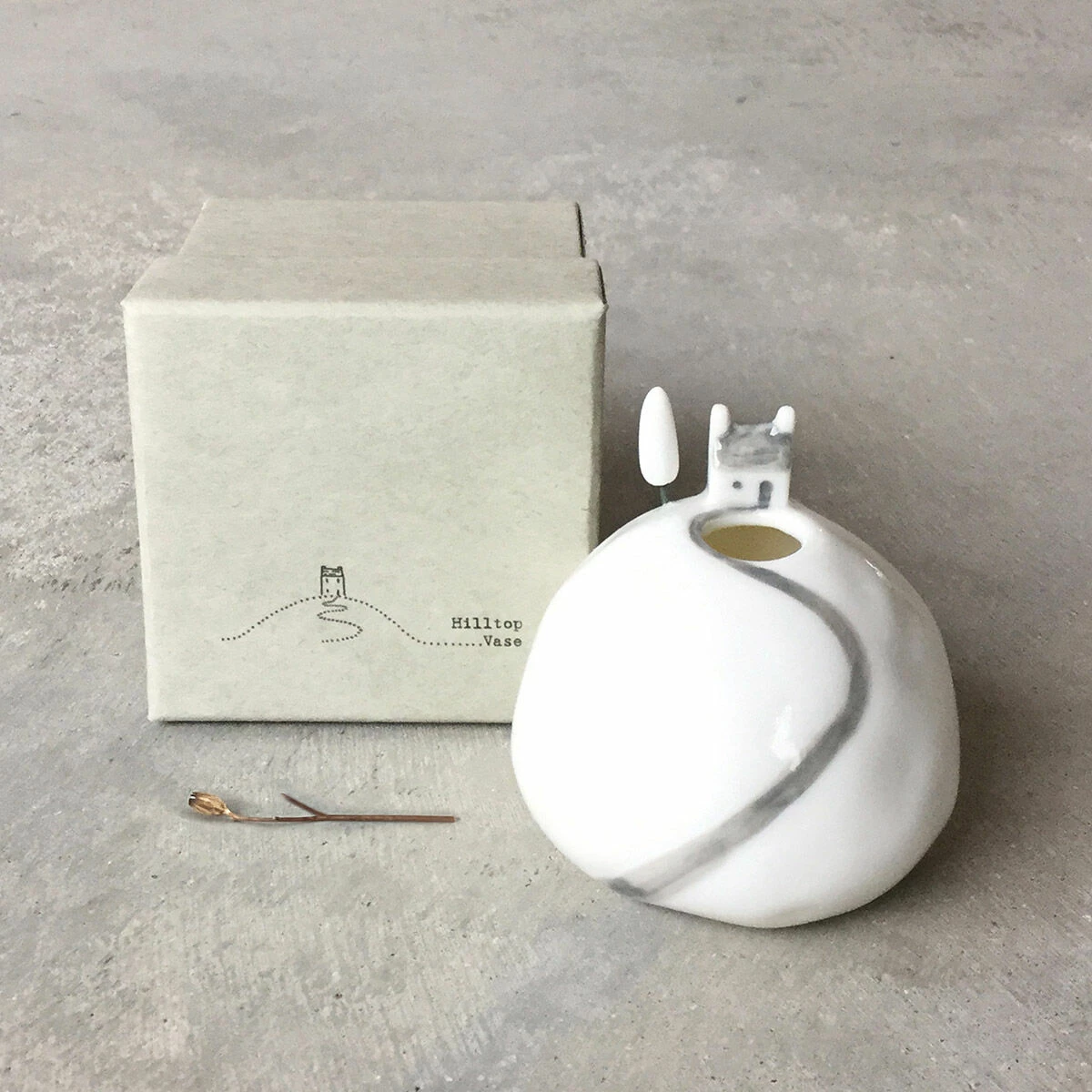 Made from crisp white porcelain with a clear gaze, the vase has been made into a round shape with a small house and tree sat on top with a winding grey driveaway leading to the front door. At the top of the vase is a small round hole, perfect for a single flower or small bunch of small flowers.