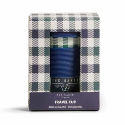 This durable travel mug is decorated with beautiful bumblebees scattered across a honeycomb pattern, printed on to a teal-blue background, and the black lid allows the pattern to become the focal point.