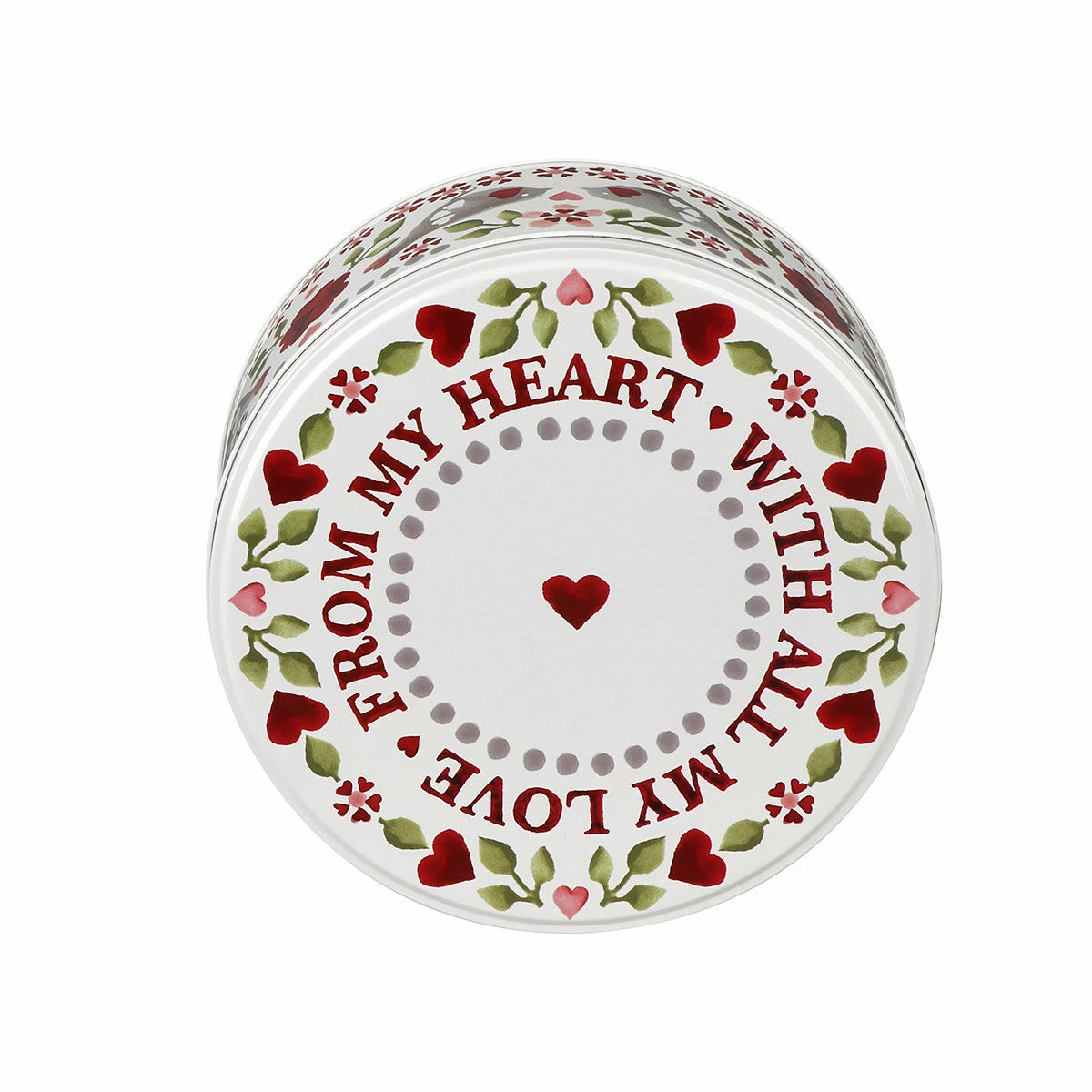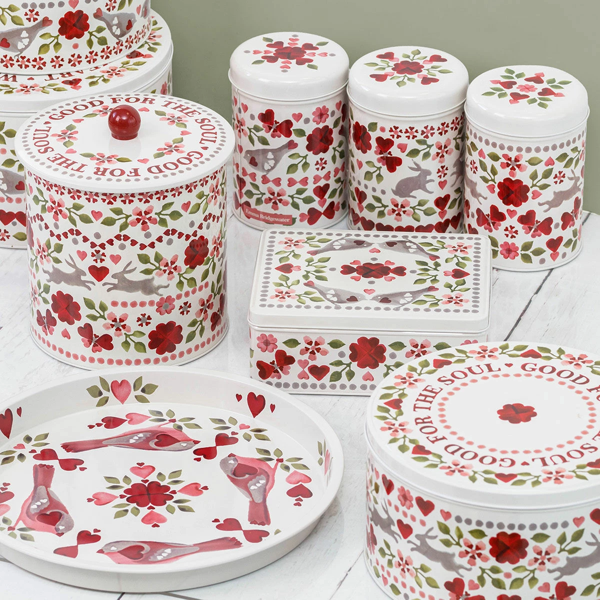 Each tin has a different decorative lovebird design, the sponge patterns are adorned with grey, pinks, greens and reds. Three decorative designs feature on these round cake tins; the smallest is adorned with a beautiful floral motif with a pait of grey birds. The floral motif continues on the lid and the words ‘With All My Love. From My Heart’ form a circle around a single dainty red heart. The medium tin is covered in a corresponding floral pattern this time complete with a few love hearts, and adorned with two grey rabbits. The floral motif continues on the lid and the words ‘Good For The Soul. Good For The Soul.’ form a circle around a single dainty red flower. The largest tin features another matching floral motif with the two love birds along with a row of red hearts. The floral motif continues on the lid and the words ‘From My Heart. With Love From Me To You.’ that forms a circle around a single grey bird sat on a sprig of greenery. The classic sponge print designs from Emma Bridgewater are scattered across a cream background allowing the patterns to stand out and create a striking look perfect for any kitchen.