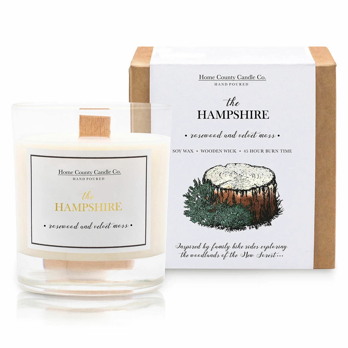 The elegant candle comes in a glass vessel with a modern stylish branded label, compete with the county title ‘The Hampshire’ written in golden text across the middle. The candle is packaged in a brown giftbox with a white sleeve featuring a stunning illustration which represents the fragrance ‘Rosewood and Velvet Moss’.
