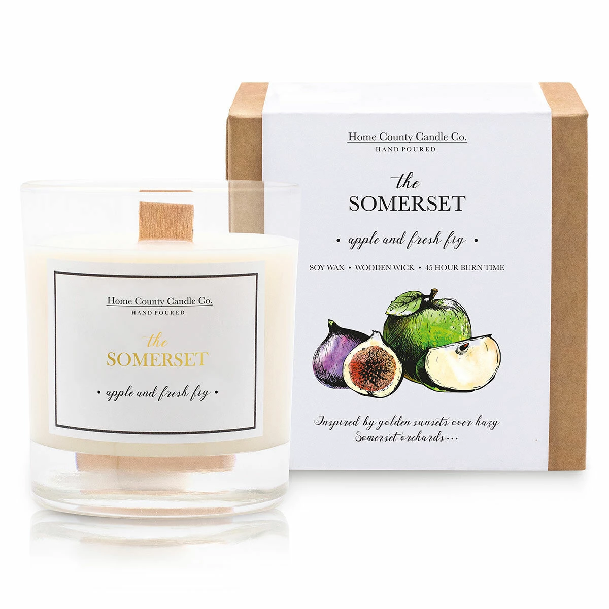 The elegant candle comes in a glass vessel with a modern stylish branded label, compete with the county title ‘The Somerset’ written in golden text across the middle. The candle is packaged in a brown giftbox with a white sleeve featuring a stunning illustration which represents the fragrance ‘Apple and Fresh Fig’.