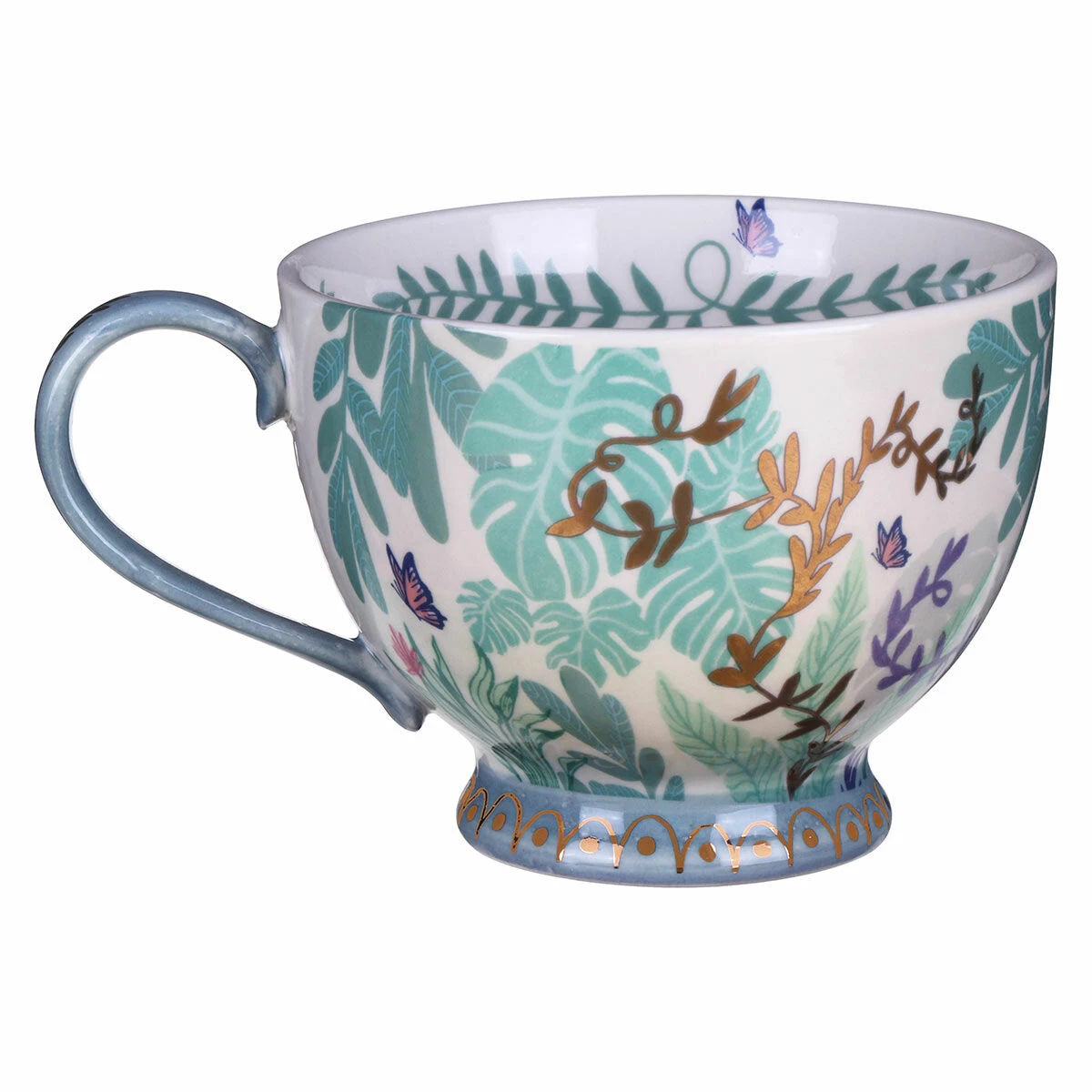This gorgeous cream teacup is decorated with delicate paintings of leaves, butterflies and gold foil plants twisting around the sides of the cup. The base is a beautiful pastel blue colour with shiny gold detailing that matches the handle. Inside the teacup is an adorable black and white cat curled up, waiting to be seen once you finish your drink.