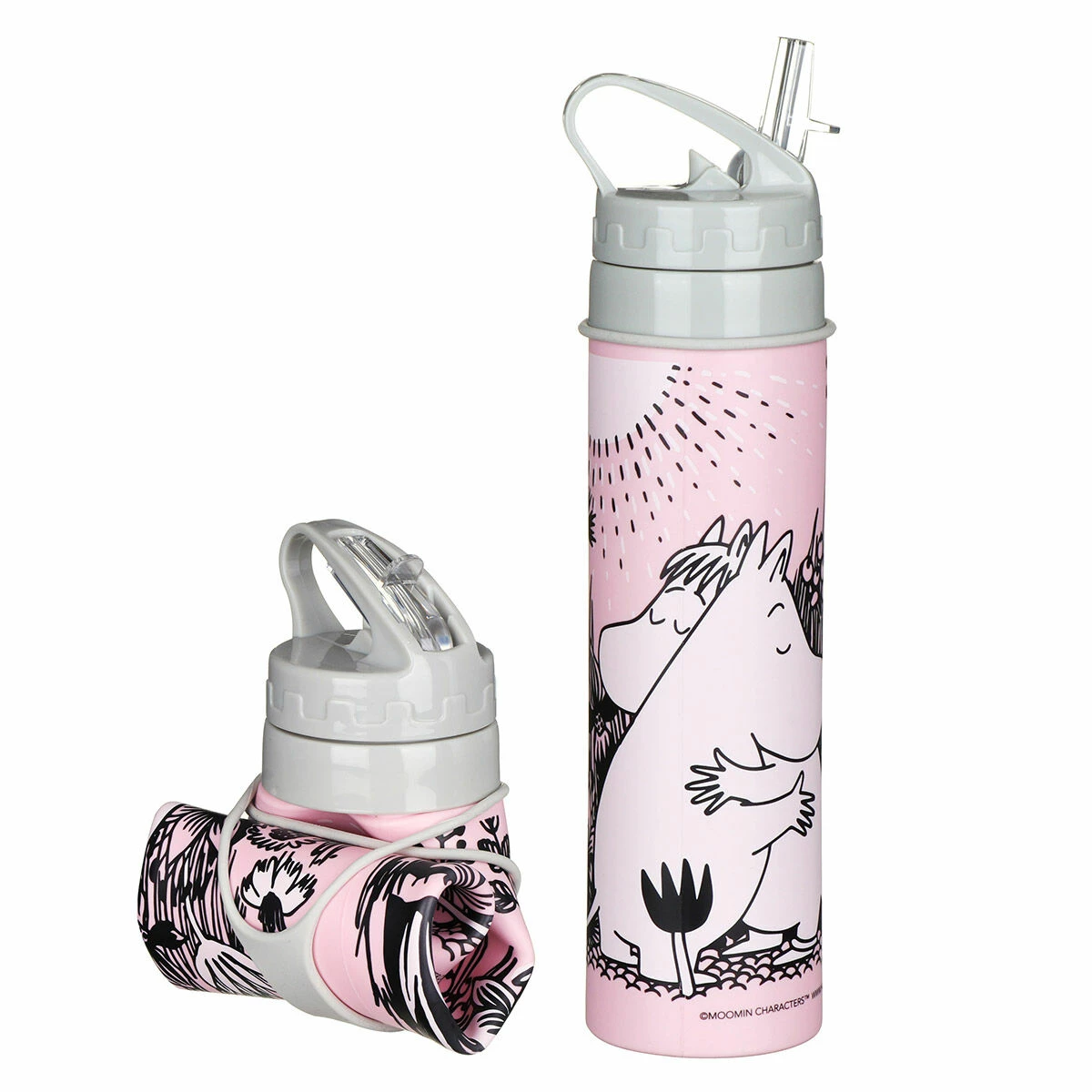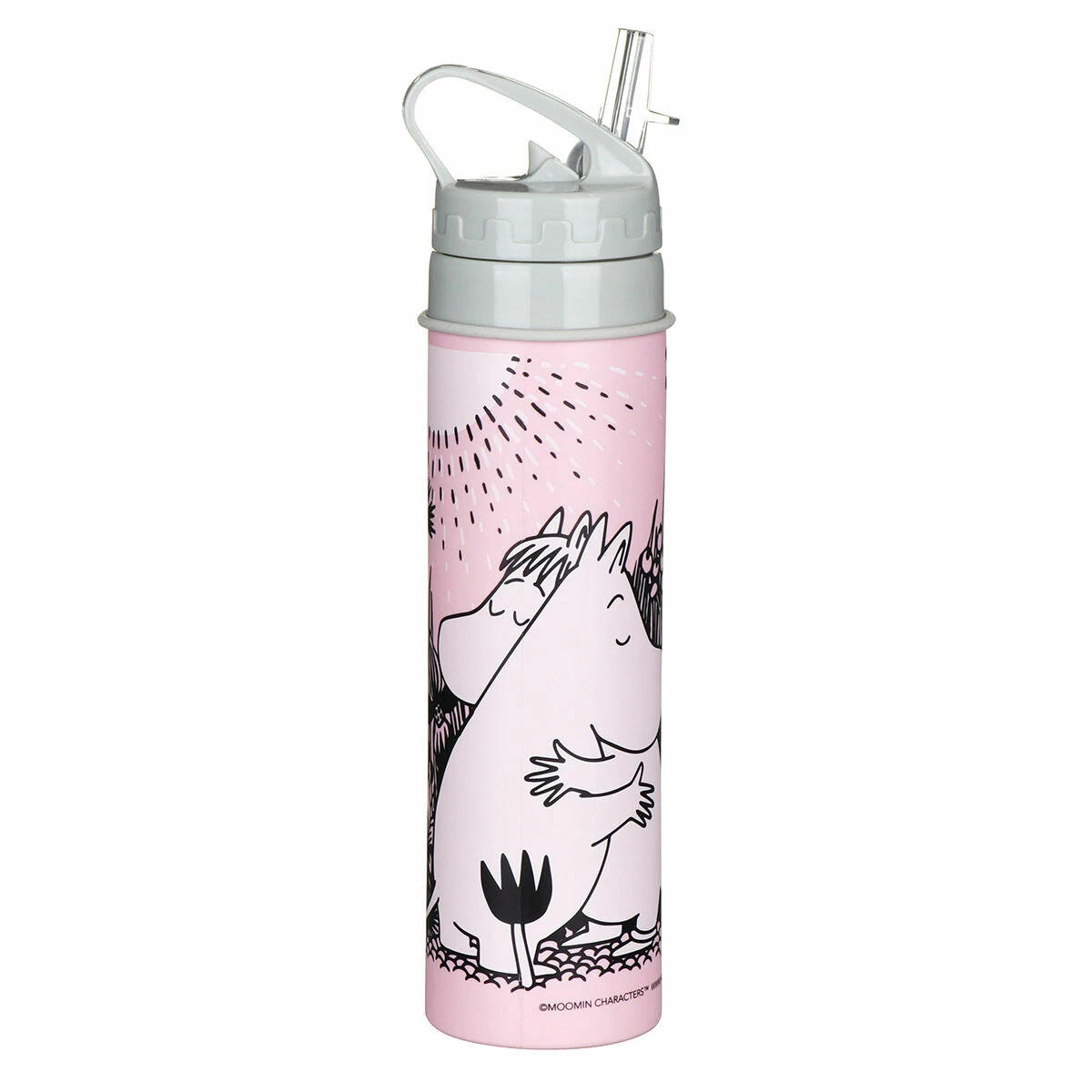 This awesome eco-friendly water bottle is decorated with the Moomin Love design, featuring Moomin and Snorkmaiden are embracing in a hug set against a pale pink background. The design is complete with a grey lid and silicone loop.