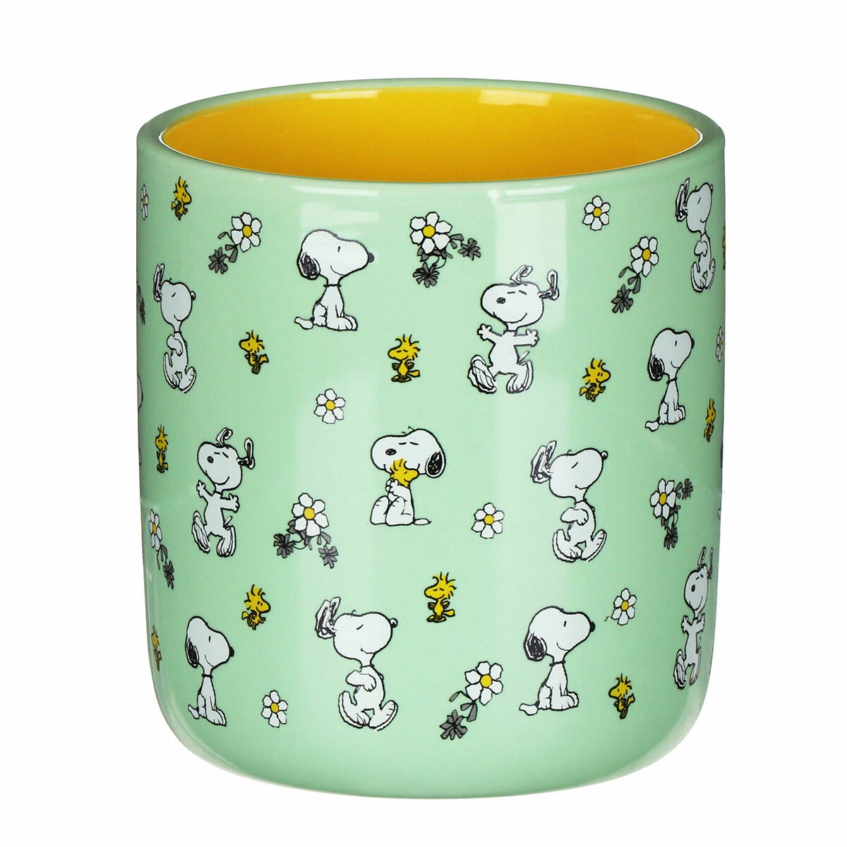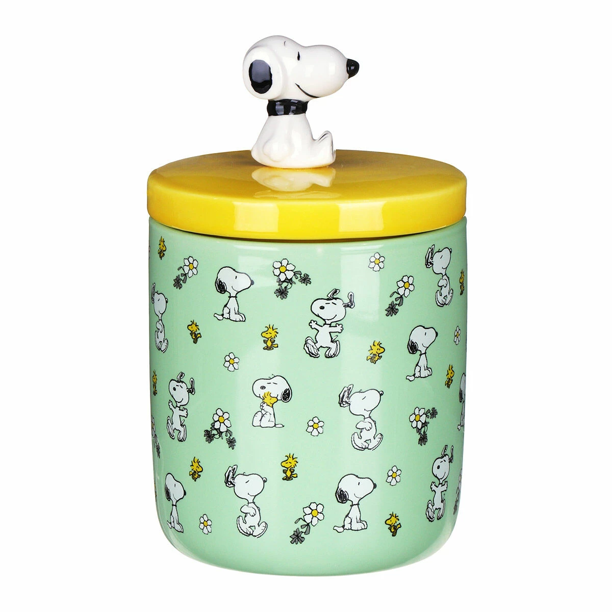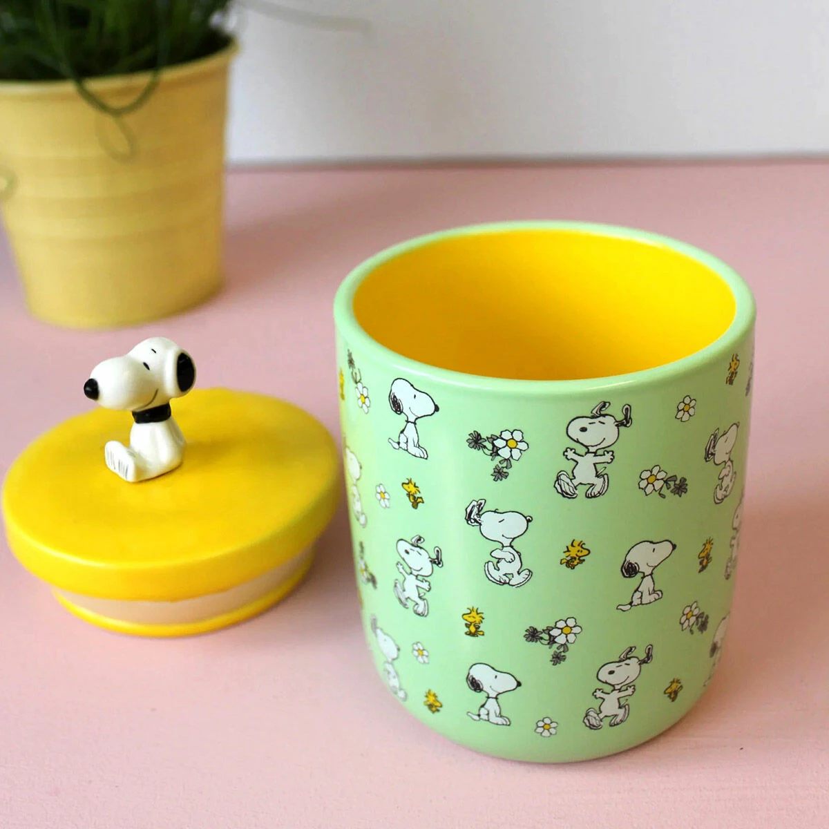The jar is the perfect size to sit on a dresser or in your cupboard filled with delights. The exterior of the jar is mint green adorned with a scatter pattern of Snoopy in various poses, accompanied by flowers and his yellow bird friend Woodstock. Inside the jar is glazed with a yellow finish, the lid which matches the inside features a rubber seal to keep the contents secure and is complete with a 3D Snoopy character which sits adoringly on top.
