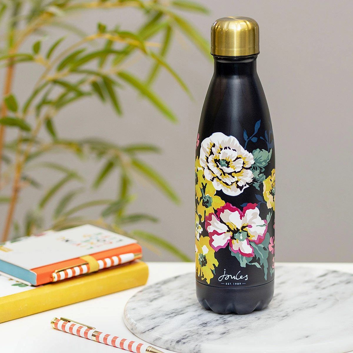 The insulated bottle is covered in bold and blousy florals in mustards, pinks, and creams, interspersed with leaves, which wraps around the body of the bottle. This is set upon a black background and the design is complete with a gold screw cap lid which contrasts beautifully with the deep backdrop.