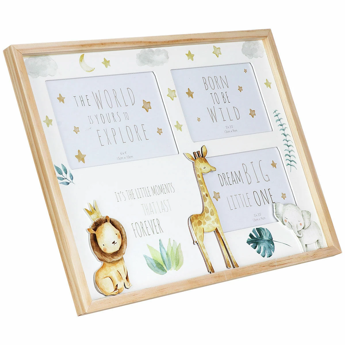 The wooden frame features space for two 5” x 3.5” images and one 4” x 6” image and has the text ‘IT’S THE LITTLE MOMENTS THAT LAST FOREVER’. There are beautiful, watercolour illustrations of safari animals such as an elephant, a giraffe and a lion wearing a crown, the king of the jungle. Scattered around are little stars, clouds and foliage that give a fun, colourful touch to the design.