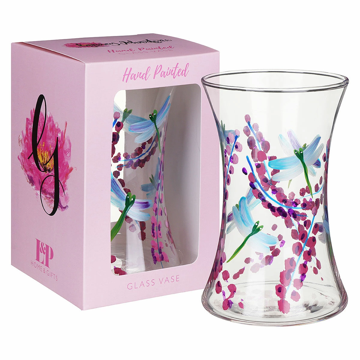Display any beautiful bouquet of flowers in your home with this gorgeous dragonfly with pink flowers hand painted vase from Lynsey Johnstone! With its colourful design, this glass is perfect for adorning your mantlepiece or coffee table.