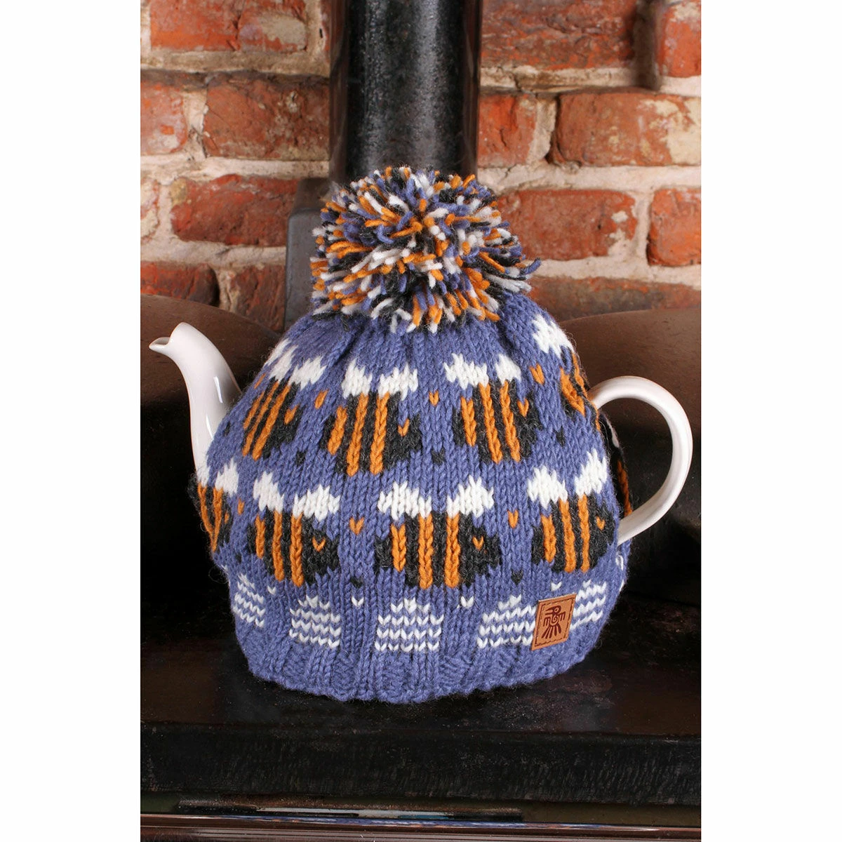 This hand knitted tea cosy is adorned with buzzing bees and made from a fine knit of 100% wool. Two rows of bees with striped bodies and white wings are set against a sky-blue background. The pattern is complete with a fleece-lined soft interior allowing it to sit snugly over your teapot allowing it to brew nicely!