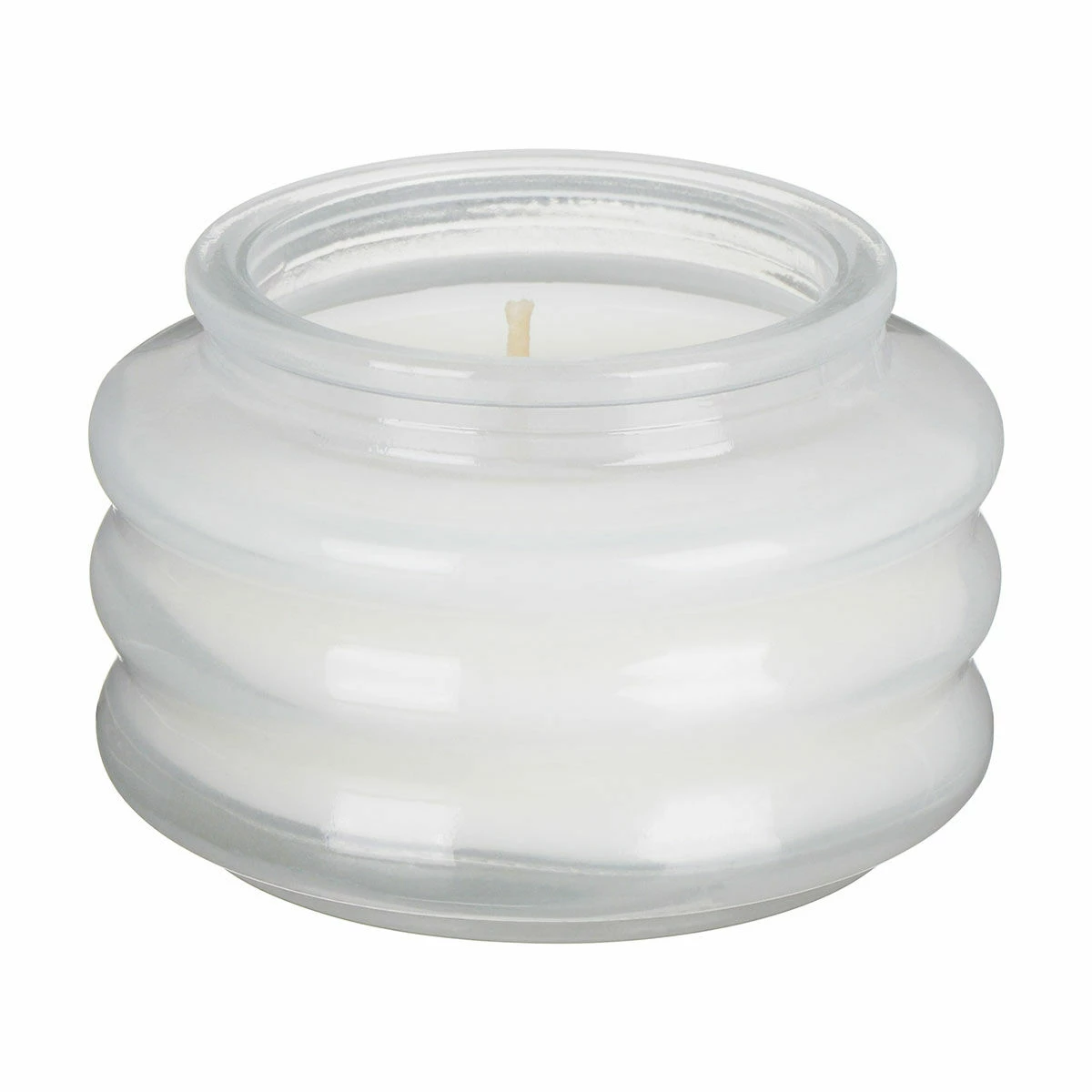This beautiful candle is made from glass which has been shaped with a ripple effect. The crisp white glass vessel is complete with a matching lid. Once you have finished with your candle the glass pot is perfect for reusing for mini succulents or as a jewellery box.