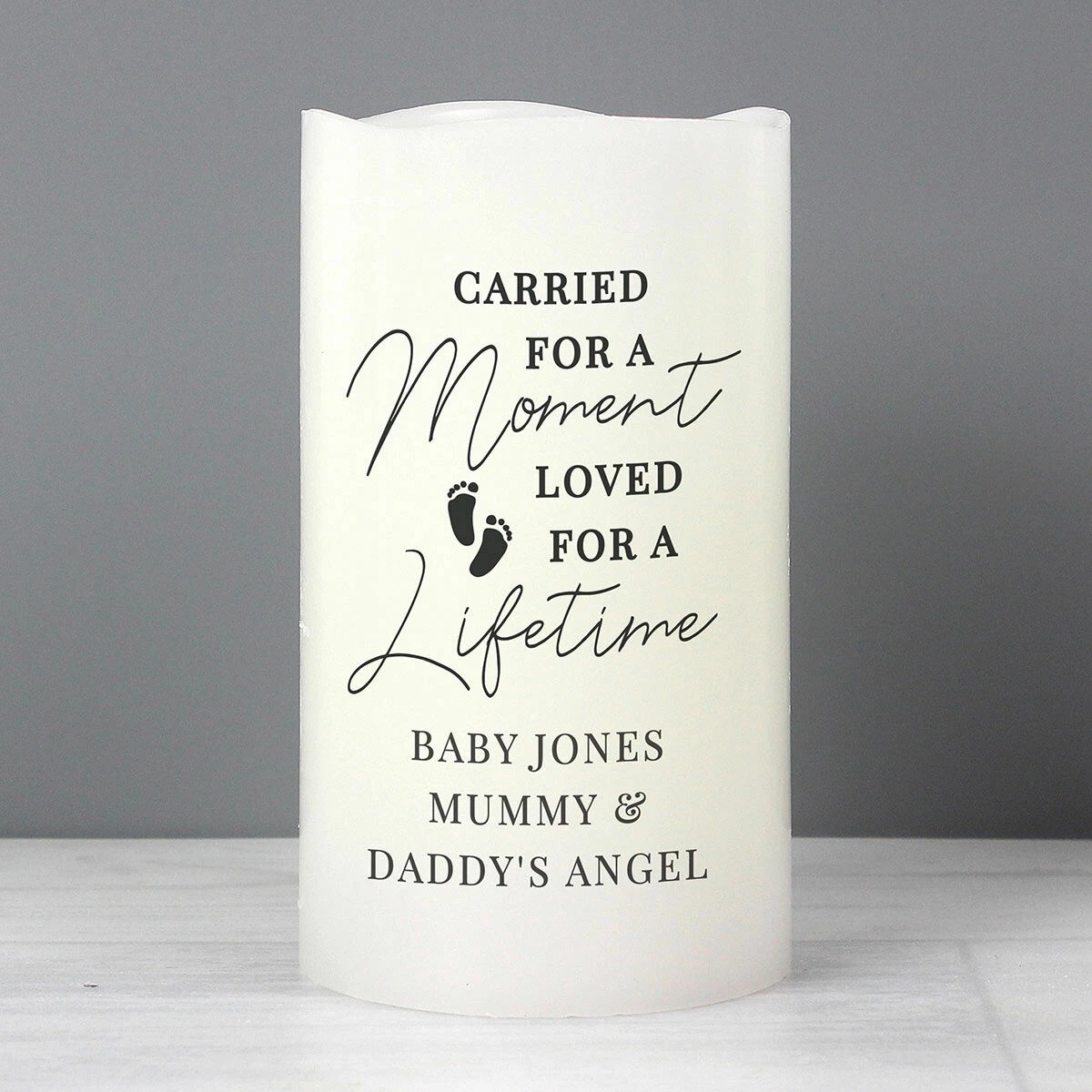 The front of the candle can be personalised with a message over 3 lines, with up to 15 characters per line. ‘Carried for a moment, loved for a lifetime’ is fixed text.