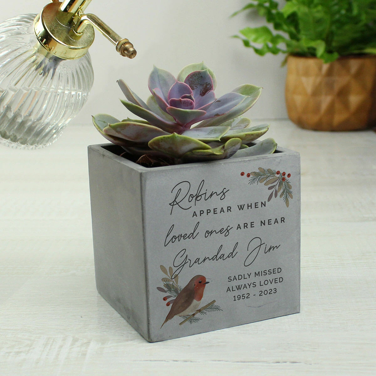 Made from concrete, this pot is embellished with a dainty rest-crested robin and sprigs of berries and leaves, along with the words, ‘Robins appear when loved ones are near’.