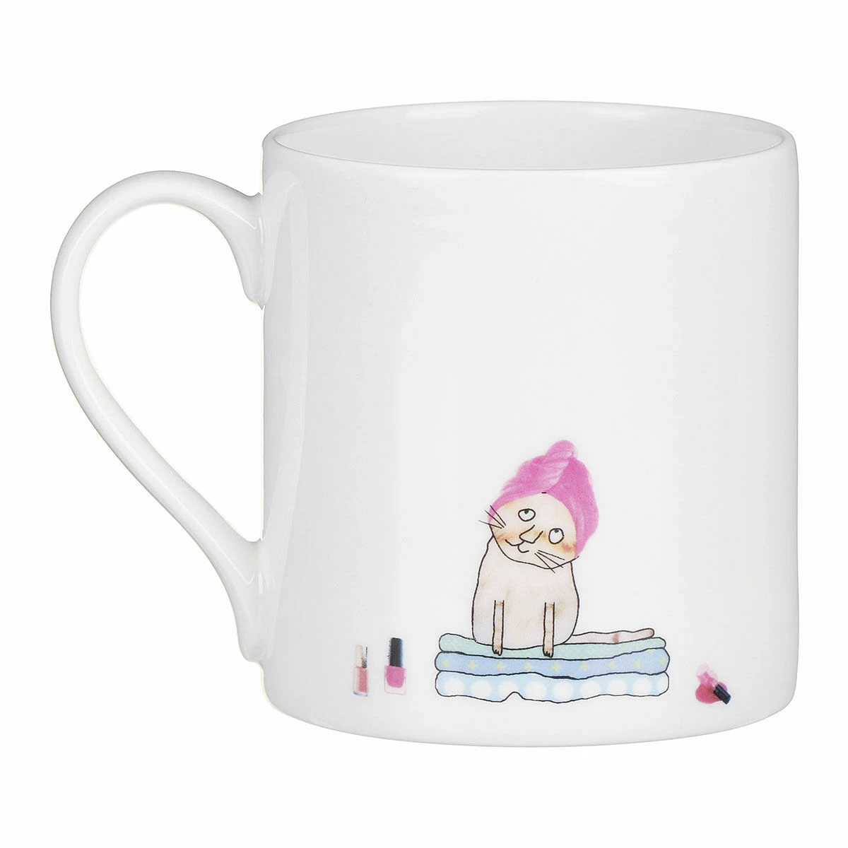 Made from bone china, the mug features an illustration of a woman dressed in a red nightdress holding a cocktail in one hand and her pampered cat in the other. The cat has cucumbers over its eyes and is wearing a blue striped jumper. The tongue-in-cheek phrase, in a typewritten font, reads;