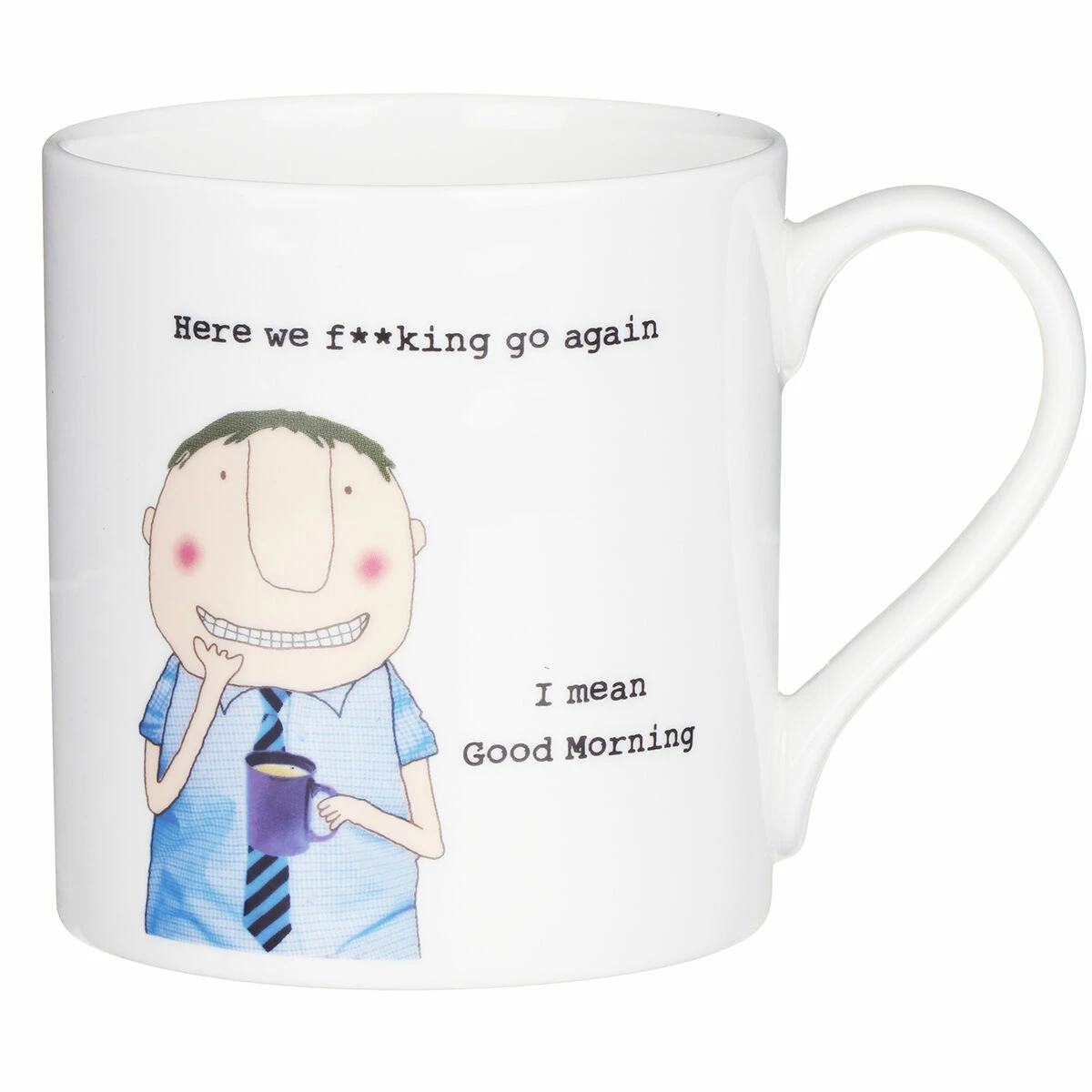 The Here We Go Again theme features a man wearing a blue shirt with tie holding a purple mug. The tongue-in-cheek phrase, in a typewritten font, reads; ‘Here We F**king Go Again. I Mean Good Morning’. The comical illustration repeats on the reverse allowing you and your friends to see the design from both sides.