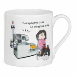 Made from bone china, the mug features an illustration of a woman who is at the supermarket checkout with bags of shopping, which consists of A LOT of wine and other booze. She has tried to scan a bunch of bananas and the self-checkout machine has said, in a typewritten font;