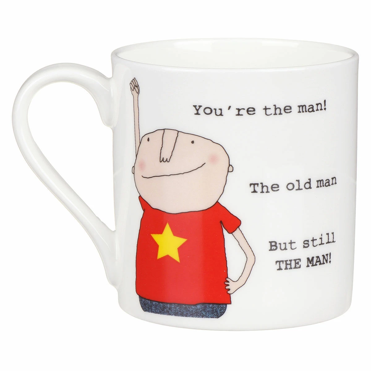 The You’re The Man theme features a man wearing a red t-shirt adorned with a yellow star, complete with his arm punching a fist in the air. The tongue-in-cheek phrase, in a typewritten font, reads; ‘You’re the man! The old man, But still THE MAN!’. The comical illustration repeats on the reverse allowing you and your friends to see the design from both sides.
