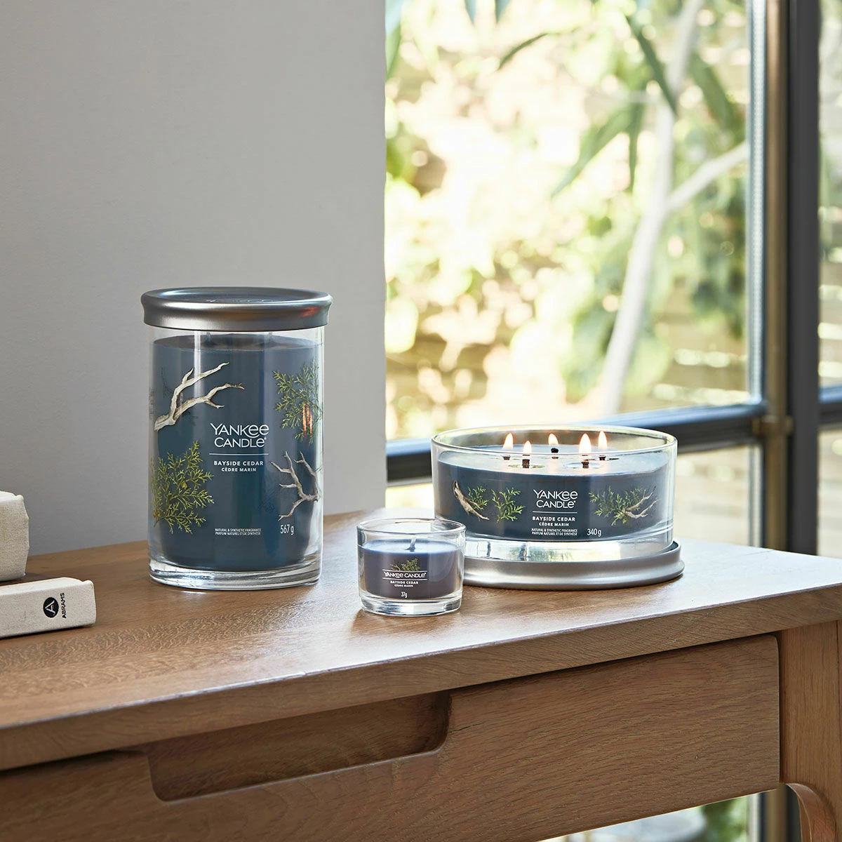 This luxurious Bayside Cedar aroma from Yankee Candle will make you picture yourself walking through a forest of cedar trees as the crisp rain falls around you. This Signature Large Tumbler is a sleek glass vessel with straight sides that complement the fragrance and will look wonderful in any home décor theme, perfect for any home. The candle comes with a silver metal lid that doubles as a stand to sit your candle on to protect your surfaces. This musky fragrance will evoke memories on late night wanders through the woods after rain has fallen, a combination of woody aromas intertwined with notes of grapefruit, mandarin blossoms and warm amber.